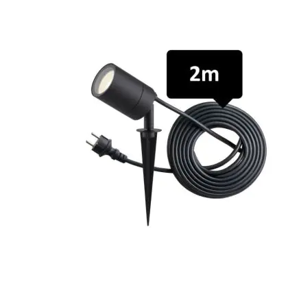 Il design a picchetto consente un facile inserimento nel terreno. Il cavo da 2 metri con spina europea semplifica il collegamento alla rete elettrica.