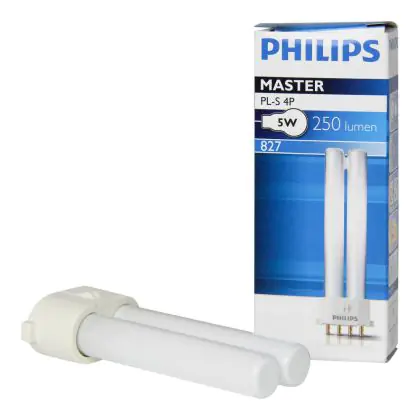 Le Philips PL-S 5W 827 4P (MASTER) sono lampade fluorescenti compatte veramente efficienti dal punto di vista energetico in quanto consumano poca energia e sono caratterizzate da una vita media incredibilmente lunga. La base di queste lampade fluorescenti a basso consumo é del tipo 2G7 a 4 pin (perni). La potenza delle medesime é pari a 5W. Quando decidi di sostituire le tue vecchie lampade fluorescenti compatte, é di estrema importanza mantenere medesima base, numero di pin (perni) e stessa potenza: se anche uno solo di questi parametri é differente dalle tue lampade originali, con tutta probabilità non riuscirai a procedere con l'installazione.