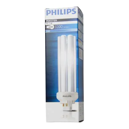 Le Philips PL-T 42W 840 4P (MASTER) sono efficienti lampade fluorescenti compatte a basso contenuto di mercurio. Sono molto efficienti e garantiscono performance ottimali di illuminazione per periodi di accensione brevi o lunghi. Tali lampade fluorescenti compatte sono dotate di attacco GX24q-4 e la base presenta 4 pin (perni). La potenza delle stesse é pari a 42W. Quando sostituisci le tue lampade fluorescenti compatte é fondamentale scegliere le nuove con il medesimo attacco, numero di pin (perni) e potenza di quelle che stai attualmente usando altrimenti non sarai in grado di installarle. Tali lampade fluorescenti assicurano una luce bianca fredda per via della temperatura di colore di 4000K. L'indice di resa cromatica é davvero buono in quanto si colloca nell'intervallo di 80-89Ra. Inoltre, la durata totale media delle lampade stesse é incredibilmente lunga, 13.000 ore!