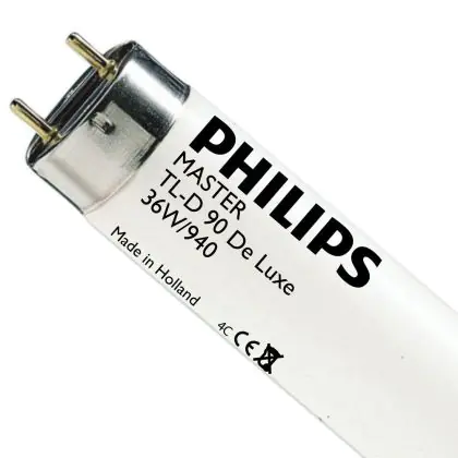 I Philips TL-D 90 De Luxe 36W 940 - 120cm (MASTER) sono tubi fluorescenti che presentano una base G13 e misurano 120cm. La potenza di questi tubi fluorescenti corrisponde a 36W. Tali tubi, che rientrano in classe energetica 'B' hanno una durata pari a 15.000 ore. L'indice di resa cromatica si assesta nell'intervallo di 90-100Ra: questo indica che i colori degli oggetti illuminati sono incredibilmente valorizzati cosí da apparire in modo molto naturale. I tubi fluorescenti in questione, grazie alla temperatura di colore di 4000K, emettono una luce bianca fredda.